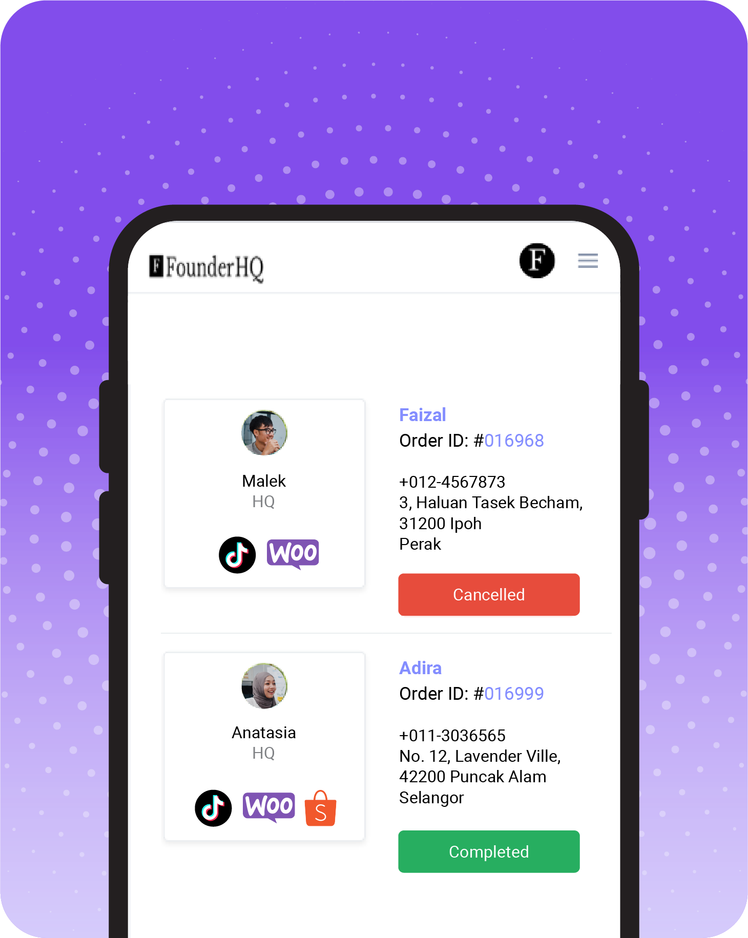 Dari jual sendiri sampai jadi bisnes multi-channel. Founder HQ bantu urus order, urus team sale, urus reseller dan pastikan customer repeat order selalu. Semua dalam satu sistem.