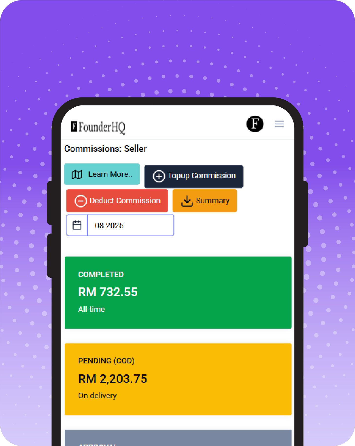 Founder HQ grow ikut tahap bisnes anda. Mula solo, scale dengan team, diversify channel, sampai customer repeat non-stop.